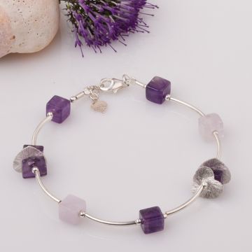 Bratara argint cu tuburi si serii de 5 cubulete din ametist si hematit