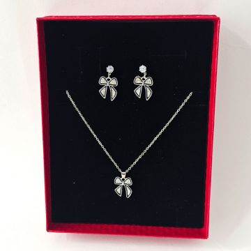 Set accesorii Feeling, din inox, cu cercei forma fundita, lantisor si pandativ cu cristale, in cutie eleganta, Argintiu